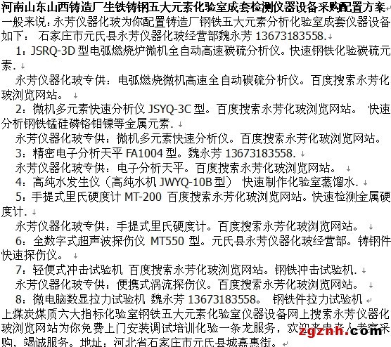 襯板鑄造廠磨片鑄鋼廠化驗(yàn)室鋼鐵五大元素檢測儀器設(shè)備采購配置表由石家莊市元氏縣永芳儀器化玻經(jīng)營部魏永芳13673183558優(yōu)質(zhì)供應(yīng)商經(jīng)銷售賣商提供。長治榆次晉城運(yùn)城太原西安榆林鄂爾多斯包頭鄭州濟(jì)南銀川蘭州西寧邯鄲保定邢臺滄州衡水廊坊霸州鑄造廠鋼鐵五大元素化驗(yàn)室成套檢測分析儀器設(shè)備網(wǎng)上搜索永芳儀器化玻瀏覽網(wǎng)站電腦碳硫儀微機(jī)錳磷硅分析儀微機(jī)鉻鉬鎳分析儀有賣產(chǎn)品質(zhì)量服務(wù)好。我們所說的鋼鐵五大元素指標(biāo)化驗(yàn)室,一般在鑄鐵球墨鑄鐵灰鐵檢測化驗(yàn)室里,鋼鐵五大元素快速化驗(yàn)分析常常包括碳、硫、錳、磷、硅五大元素。在鑄鋼檢測化驗(yàn)室里,通常還要快速分析碳、錳、鎳,這里不一一贅述。