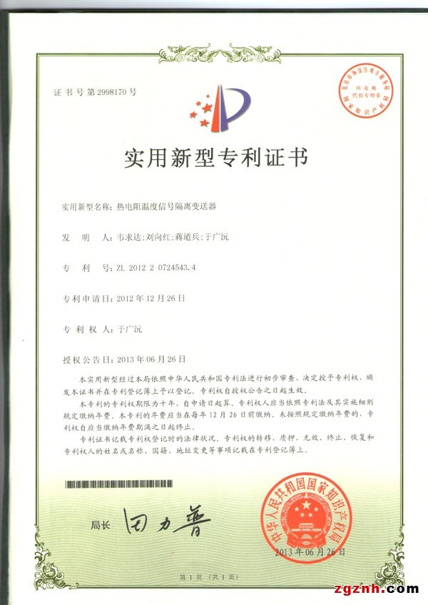 PT100熱電阻信號(hào)隔離變送器IC獲專(zhuān)利證書(shū)