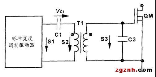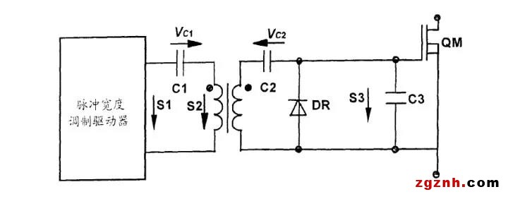 由此可見,這種隔離驅(qū)動電路線路簡單,而且被驅(qū)動的MOS管有負向的驅(qū)動電壓,抗干擾能力強。但其有待改進之處在于,在占空比D較大時,S3的高電平幅值(1-D)·VS1就較小,可能導(dǎo)致QM驅(qū)動電壓不足。這樣,這種驅(qū)動器電路不適合應(yīng)用在占空比變化較大的場合,即輸入比范圍大的應(yīng)用條件下,圖1所示的驅(qū)動電路將不再適用。