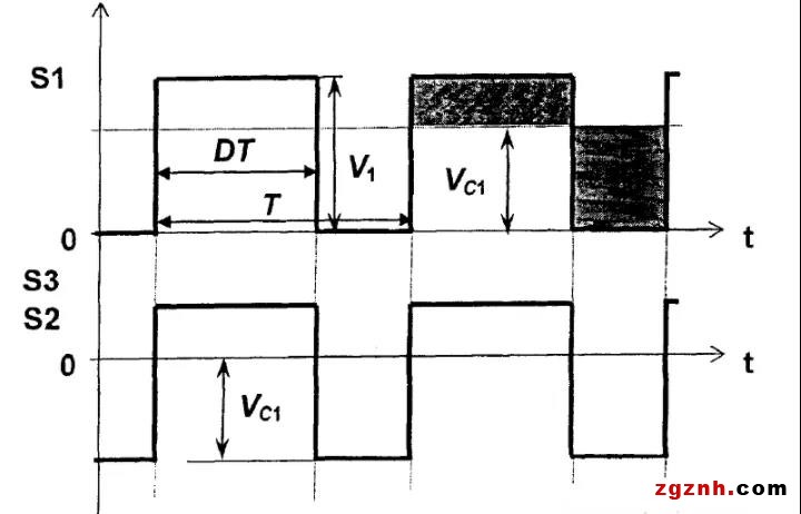 其中,電容C1為輸入端直流隔離電容,C3為開關(guān)管QM等效的輸入電容。電容電壓的參考方向如圖1所示,T1為磁隔離驅(qū)動變壓器。S1是脈沖寬度調(diào)制驅(qū)動器(PWM Driver)的輸出信號波形,S2是變壓器輸入端的波形,S2是該磁隔離驅(qū)動器的輸出波形。圖1所示的電路工作波形如圖2所示。