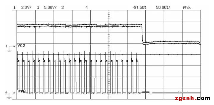為了解決圖3中雙隔直磁隔離驅(qū)動電路的誤導(dǎo)通問題,金升陽公司針對次級隔直電容C2做了特殊放電電路。如圖6所示,其中添加了原邊檢測電路和次級隔直電容放電電路,該電路為金升陽公司自主發(fā)明專利電路。通過高速光耦做信號隔離,有效解決主功率開關(guān)管誤導(dǎo)通的問題,改進后的驅(qū)動波形如圖72通道PWM波形所示,可以看出在驅(qū)動異常關(guān)閉狀態(tài)下,C2上的電壓迅速放電完成,開關(guān)管不會出現(xiàn)異常開通狀態(tài)。為金升陽公司超高超寬壓輸入系列產(chǎn)品提供高可靠的驅(qū)動,提升產(chǎn)品綜合競爭力。