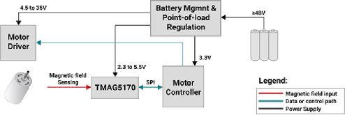 圖 2:采用TMAG5170線性3D霍爾效應(yīng)位置傳感器的自主移動(dòng)機(jī)器人輪子電機(jī)模塊方框圖