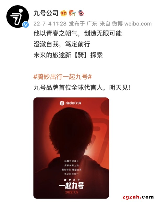 九號公司官方微博今日發(fā)布消息稱,將于7月5日官宣品牌首位全球代言人。根據(jù)目前的預(yù)熱海報剪影有粉絲推測,九號公司此次簽約的品牌全球代言人極有可能是新生代演員易烊千璽。