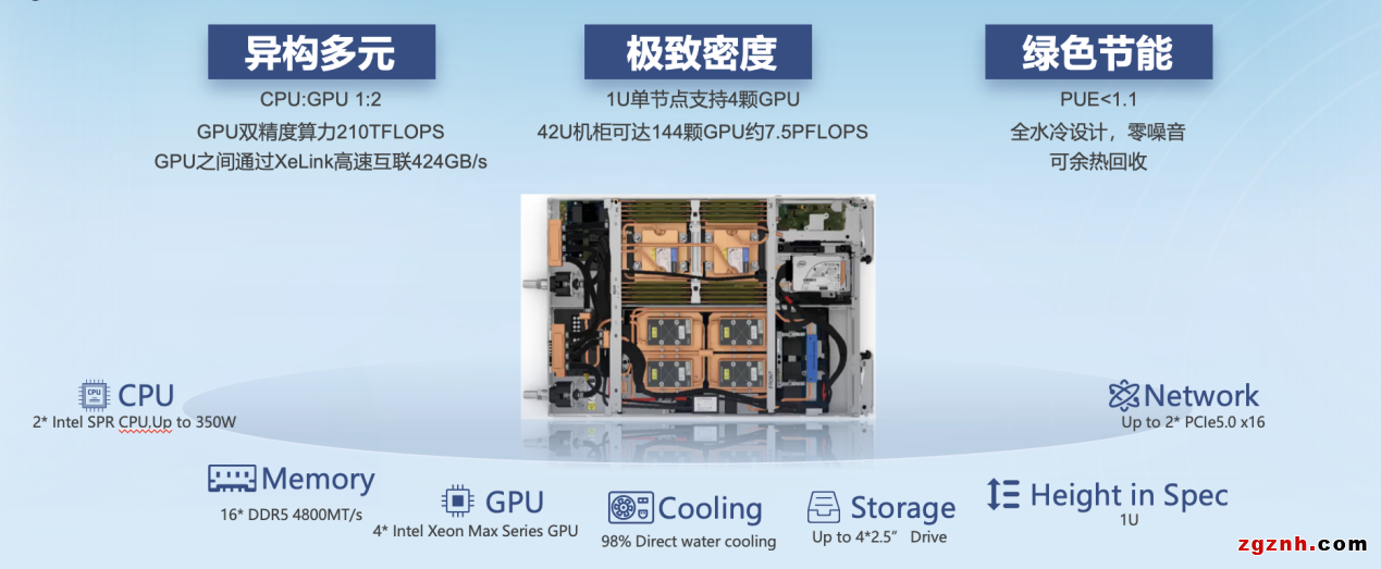 基于此,聯(lián)想推出了科學(xué)異構(gòu)計(jì)算服務(wù)器——聯(lián)想Think System SD650-I V3。這款服務(wù)器可實(shí)現(xiàn)異構(gòu)多元,CPU和GPU的比例是1:2,可以進(jìn)行最佳的異構(gòu)計(jì)算。此外,GPU的雙精度算力單節(jié)點(diǎn)額可達(dá)到210TFLOPS,GPU之間可通過Xelink進(jìn)行高速互聯(lián)。該服務(wù)器還具有極致高密和綠色節(jié)能的特點(diǎn):42U整機(jī)柜可以支持多達(dá)144顆GPU,提供7.5PFLOPS的雙精度算力; PUE小于1.1, 全水冷設(shè)計(jì),零噪音,可支持余熱回收。