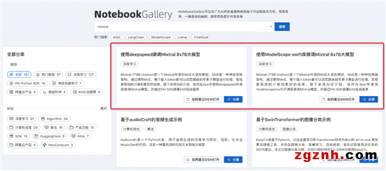 PAI-DSW是云端機(jī)器學(xué)習(xí)開(kāi)發(fā)IDE,為用戶提供交互式編程環(huán)境,同時(shí)提供了豐富的計(jì)算資源。我們?cè)谥谴a實(shí)驗(yàn)室(https://gallery.pai-ml.com/)Notebook Gallery中上線了兩個(gè)微調(diào)Mixtral 8x7B MOE大模型的示例,參見(jiàn)下圖: