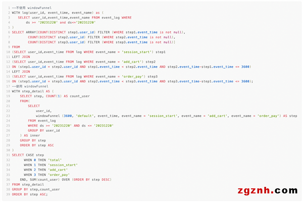第一個(gè)是純SQL的方式,第二個(gè)是用 Hologres windowFunne 聚合函數(shù)。使用第一個(gè)JOIN SQL會(huì)有性能問(wèn)題,因?yàn)榇嬖诙嗖絁OIN操作,隨著計(jì)算事件量的增加,時(shí)間復(fù)雜度會(huì)指數(shù)級(jí)放大。而第二個(gè)使用漏斗函數(shù)的SQL則變得簡(jiǎn)單許多。