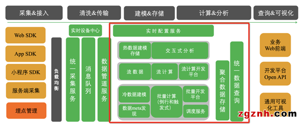 如下圖所示,在大數(shù)據(jù)領(lǐng)域這是一個(gè)比較通用的數(shù)據(jù)處理 pipeline,貫穿數(shù)據(jù)的加工&使用過(guò)程包括,數(shù)據(jù)采集&接入、數(shù)據(jù)清洗&傳輸、數(shù)據(jù)建模&存儲(chǔ)、數(shù)據(jù)計(jì)算&分析 以及 查詢&可視化,其中友盟U-App 數(shù)據(jù)處理的核心架構(gòu)是紅框部分。