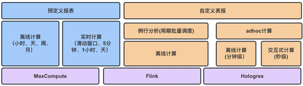 針對(duì)報(bào)表類型不同的看數(shù)場(chǎng)景和業(yè)務(wù)需求,我們底層技術(shù)架構(gòu)通過(guò)多種產(chǎn)品來(lái)支撐。在數(shù)據(jù)新鮮度方面,分別使用 Flink 和 MaxCompute 提供了T+0 的實(shí)時(shí)計(jì)算 和 T+1的離線批量計(jì)算,主要支持預(yù)置報(bào)表的計(jì)算場(chǎng)景,并將計(jì)算好的結(jié)果導(dǎo)出到類Hbase 存儲(chǔ),能夠支持高并發(fā)的報(bào)表查詢。在分析時(shí)效性方面,使用阿里云的Hologres 實(shí)現(xiàn)自定義報(bào)表支持秒級(jí)的 OLAP分析,當(dāng)處理的數(shù)據(jù)周期跨度大時(shí),可能會(huì)出超過(guò)內(nèi)存算子處理范圍,因此我們轉(zhuǎn)化為離線計(jì)算引擎來(lái)執(zhí)行,同時(shí)也讓交互體驗(yàn)從同步降級(jí)為異步。