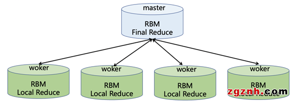 計(jì)算過(guò)程如下圖所示,整個(gè)過(guò)程可以分為兩個(gè)階段:在Worker節(jié)點(diǎn)會(huì)進(jìn)行第一次聚合,由于Worker間數(shù)據(jù)完全正交,數(shù)據(jù)沒(méi)有shuffle過(guò)程,不需要跨幾點(diǎn)轉(zhuǎn)移數(shù)據(jù),效率會(huì)非常高;在Master節(jié)點(diǎn)進(jìn)行最終聚合通過(guò)簡(jiǎn)單匯總得到最終結(jié)果。