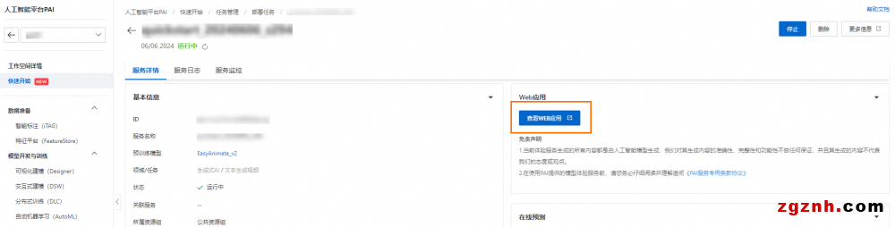 1. 在服務詳情頁面,單擊查看WEB應用。