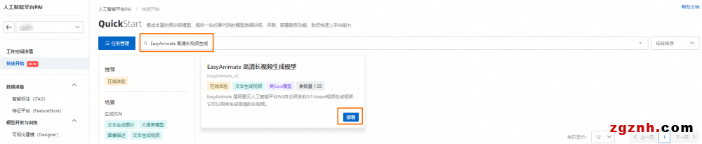 2. 在快速開始頁面,搜索EasyAnimate 高清長視頻生成,然后單擊部署,配置相關參數(shù)。