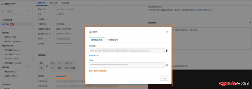 1.在服務詳情頁面的資源詳情區(qū)域,單擊查看調用信息,獲取調用服務所需的信息。