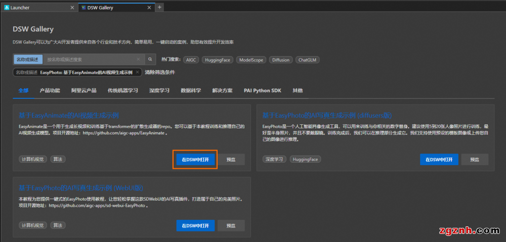 3. 在DSW Gallery頁面中,搜索EasyPhoto: 基于EasyAnimate的AI視頻生成示例,單擊在DSW中打開,即可自動將本教程所需的資源和教程文件下載至DSW實例中,并在下載完成后自動打開教程文件。