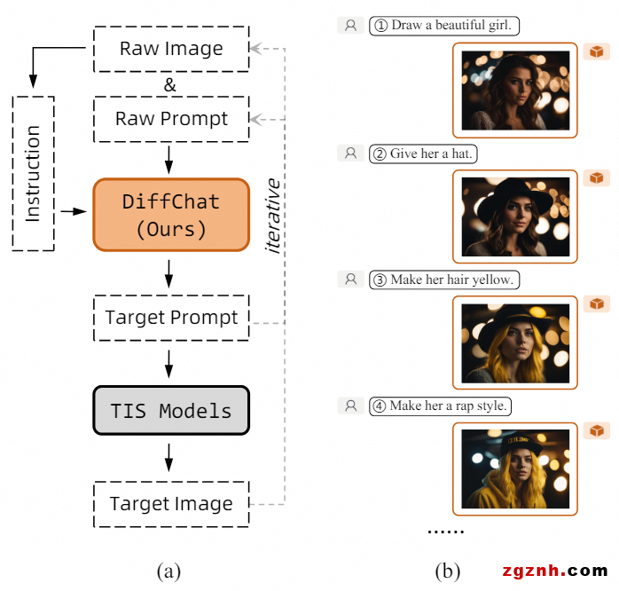 基于擴(kuò)散模型的文圖生成模型(例如Stable Diffusion)的效果有時(shí)會(huì)受到輸入文本即提示詞撰寫的影響。當(dāng)用戶對(duì)創(chuàng)作的圖像有特定需求或者希望執(zhí)行特定的內(nèi)容修改時(shí),通常需要進(jìn)行反復(fù)多次的提示詞修改,且每次嘗試的結(jié)果都是不可預(yù)期的。 這造成了不可忽略的時(shí)間和計(jì)算資源的耗費(fèi)?;谶@一問(wèn)題,我們提出了DiffChat,這是一個(gè)文到文的多輪生成模型,可以根據(jù)用戶的需求指令對(duì)原始提示詞進(jìn)行適當(dāng)?shù)男薷?,得到新的提示詞來(lái)使得文到圖生成模型能夠生成更美觀且符合指令的圖像。整個(gè)過(guò)程做到了用戶和文圖生成模型的迭代交互,最終完成用戶的創(chuàng)作需求。