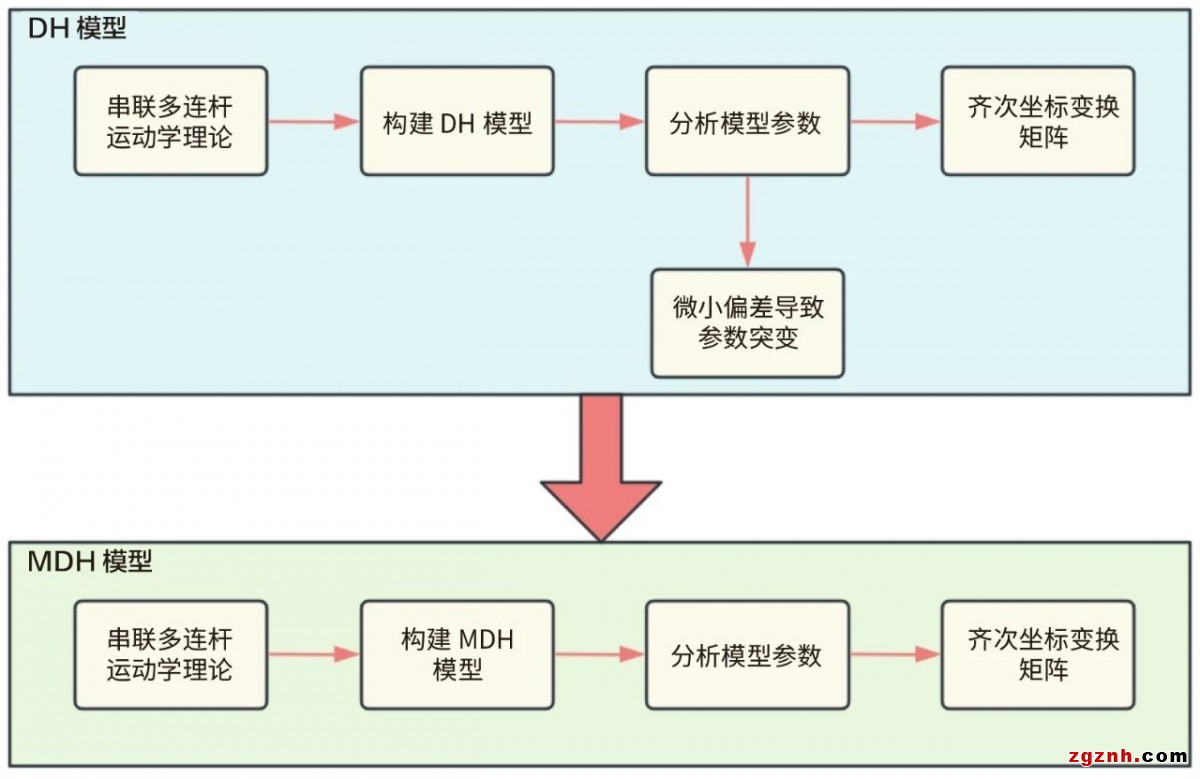 基于串聯(lián)多連桿運(yùn)動(dòng)學(xué)理論,華成工控研究團(tuán)隊(duì)構(gòu)建基礎(chǔ)DH模型,通過(guò)齊次變換矩陣描述基坐標(biāo)系到末端的位姿關(guān)系。深入剖析發(fā)現(xiàn)DH模型存在參數(shù)奇異性和易變形問(wèn)題,微小偏差可能引發(fā)參數(shù)突變,影響模型準(zhǔn)確性。為解決這一難題,團(tuán)隊(duì)創(chuàng)新提出MDH模型,優(yōu)化模型參數(shù),確保運(yùn)動(dòng)學(xué)參數(shù)的完備性,降低模型對(duì)微小偏差的敏感性,為后續(xù)精確標(biāo)定奠定堅(jiān)實(shí)基礎(chǔ)。