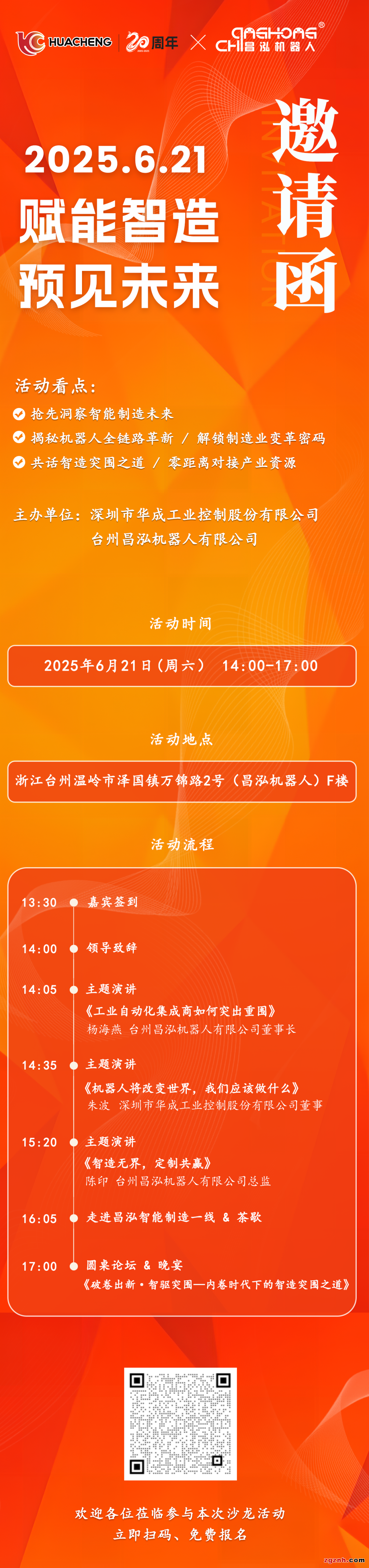 6月21日,由深圳市華成工業(yè)控制股份有限公司、臺州昌泓機器人有限公司聯(lián)合主辦的《賦能智造 預見未來》主題沙龍活動,將在浙江臺州開啟,期待您的參與!