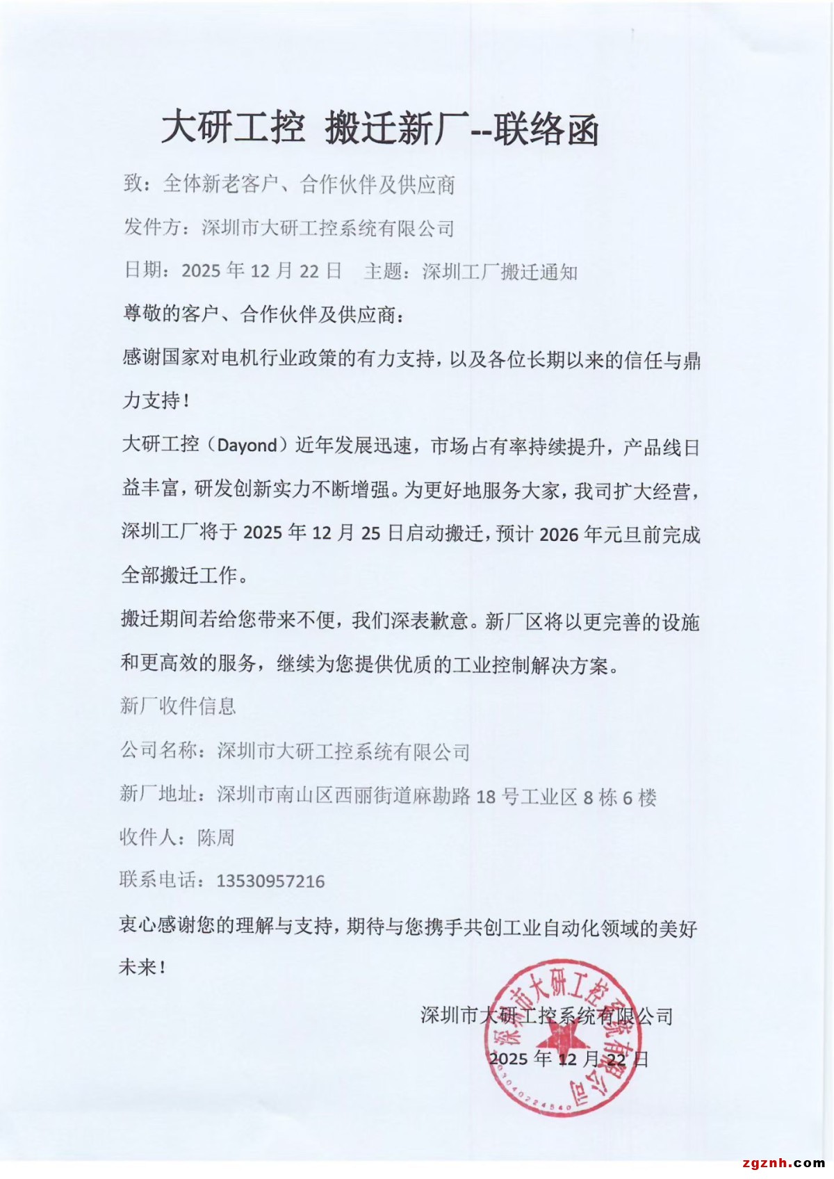 深圳市智能化學(xué)會理事單位——深圳市大研工控系統(tǒng)有限公司近年來發(fā)展迅速,為擴大經(jīng)營,喜搬新廠房!2025年12月25日后陸續(xù)入駐新廠,歡迎新老客戶朋友們,元旦后蒞臨參觀和指導(dǎo)工作!