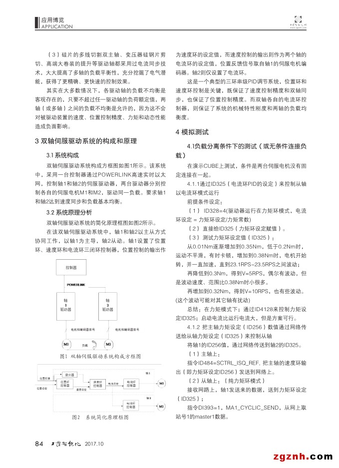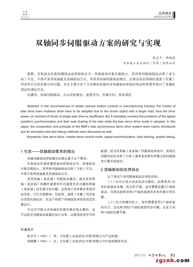 在制造業(yè)的某些精密運動控制場合中,因被驅動對象負載較大,采用單伺服軸驅動功率(或力矩)不足,不得不采用雙軸甚至多軸驅動方式。而采用雙軸伺服驅動模式,必然涉及到兩軸的速度(位置)同步和它們的負載分擔問題。本文主要介紹了貝加萊的雙軸同步伺服驅動系統(tǒng)的構成和原理并探討了其模擬測試和調試方法。