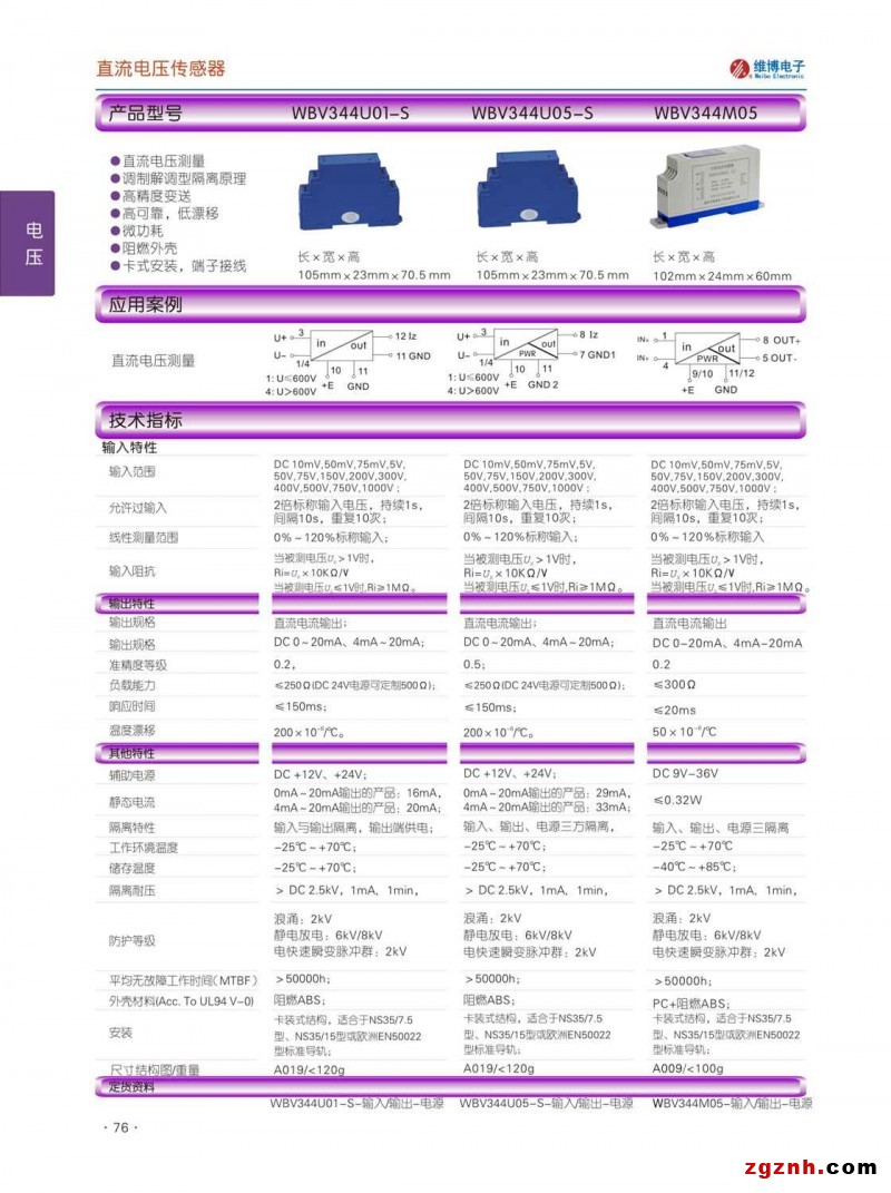 維博電子 WB V344M05高可靠M0型電量隔離傳感器采用調(diào)制解調(diào)原理,對(duì)電網(wǎng)和電路中的直流電壓進(jìn)行實(shí)時(shí)測(cè)量,將其變換為0mA~20mA或4mA~20mA直流電流(IZ)輸出;具有高精度、高隔離、低功耗、低漂移、溫度范圍寬、抗干擾能力強(qiáng)、工作電源范圍寬等特點(diǎn)。本產(chǎn)品采用卡裝式結(jié)構(gòu),端子接線,安裝方便,輸入、輸出、電源之間三隔離,適用于電源設(shè)備、電力網(wǎng)監(jiān)測(cè)自動(dòng)化系統(tǒng)、工控監(jiān)測(cè)系統(tǒng)、鐵路信號(hào)系統(tǒng)等。