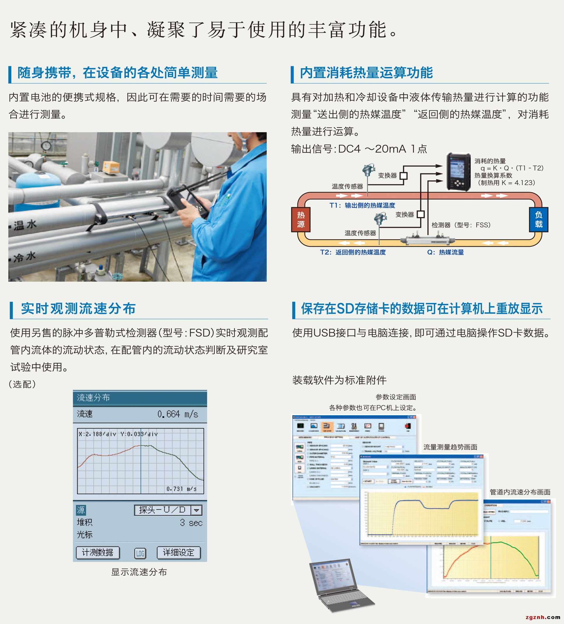 產品簡介: 富士便攜式超聲波流量計,小巧輕盈,中文顯示,使用方便,SD存儲卡,可保存長期測量的數據,帶消耗熱量運算功能 ,可通過多普勒法顯示流速分布 ,依靠電池驅動連續(xù)工作12小時 ,一體化打印機 ,方便PC連接的USB接口